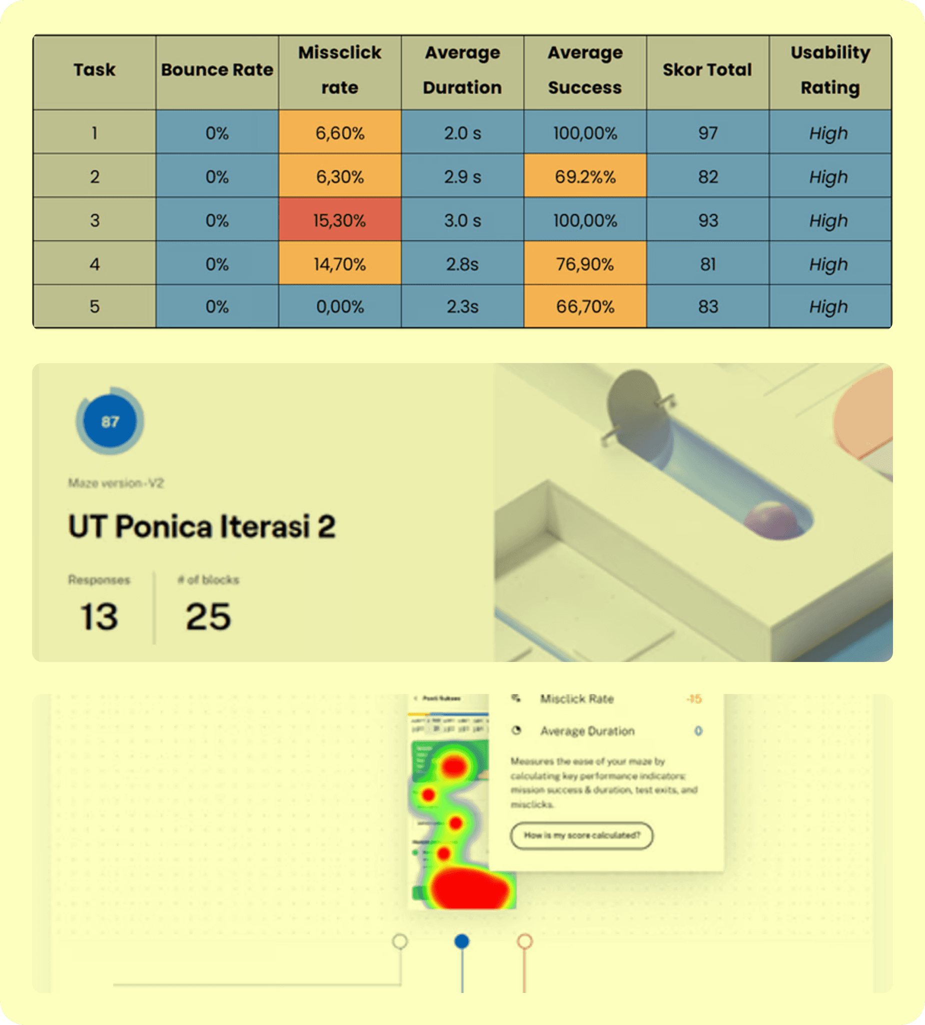 The test is conducted through two iteration stages using the unmoderated usability testing method with the maze.co. Using that tools, we looked at the usability score for each task, the level of user satisfaction with a job in the test, and the comments they left on each task.