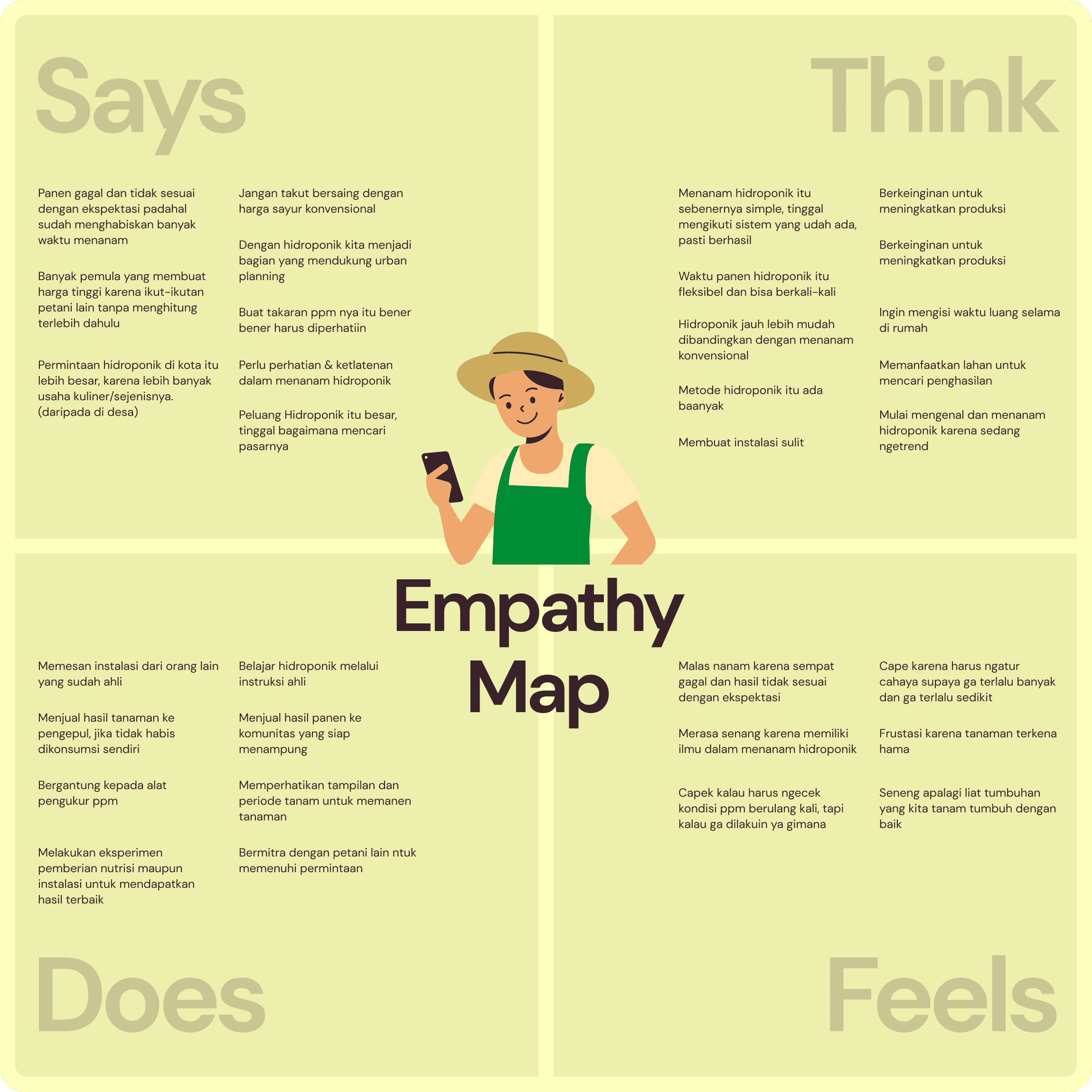 Empathize - During this phase, we conducted desk research and literature reviews to gather statistical data on hydroponics, particularly in Indonesia. To validate the information, we conducted two additional types of research: in-depth interviews and questionnaires to hydroponic growers.